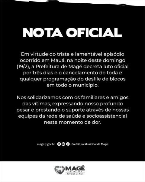 PREFEITURA DE MAGÉ DECRETA LUTO OFICIAL DE TRÊS DIAS E CANCELAMENTO DO CARNAVAL