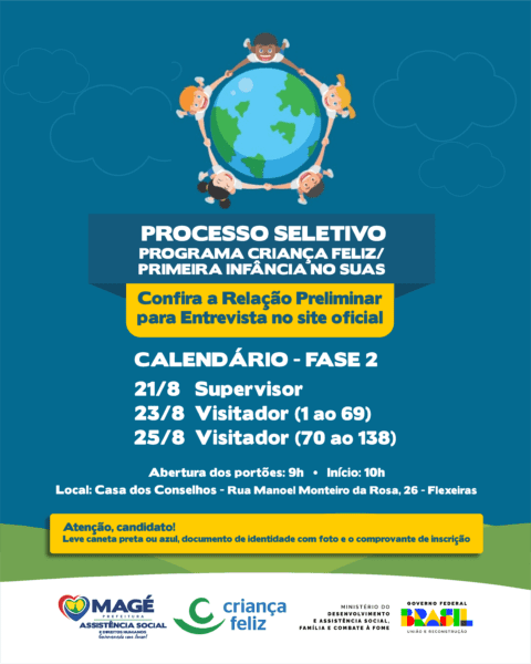 A Prefeitura de Magé, através da Secretaria de Assistência Social e Direitos Humanos, divulga a relação preliminar dos convocados para a fase 2, em seguimento do processo seletivo para contratação temporária de profissionais para atuação no Programa Criança Feliz. Calendário da fase 2: 21/08 Supervisor; 23/08 Visitador (1 ao 69); 25/08 Visitador (70 ao 138). […]