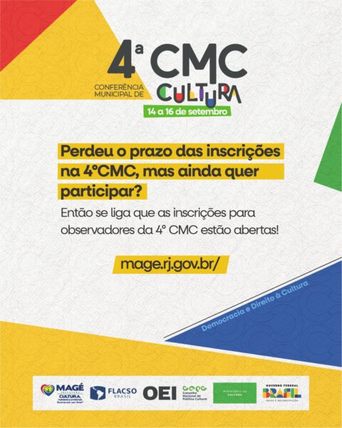 Nos dias 14, 15 e 16 de setembro, a Prefeitura de Magé promoverá a 4ª Conferência Municipal de Cultura. O evento focará no debate de questões relacionadas às políticas públicas de cultura na cidade. Se você perdeu o prazo de inscrição para a conferência, ainda há uma chance de participar como Observador. Nessa função, você terá a oportunidade de assistir a painéis, palestras, apresentações culturais e acompanhar a discussão dos grupos de trabalho. Os detalhes devem preencher o formulário de inscrição até dia 8 de setembro.