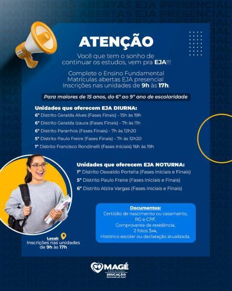 Além da novidade de oferecer a Educação de Jovens e Adultos de forma semipresencial, a Prefeitura de Magé manterá o tradicional formato de turmas presenciais e as matrículas já estão abertas. A modalidade é ofertada com turmas do 6º ao 9º ano do Ensino Fundamental para mageenses com 15 anos ou mais. A EJA Presencial […]