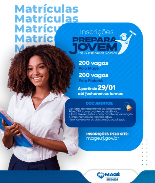 Atenção estudantes! Estão abertas as inscrições do Prepara Jovem, o pré-vestibular social da Prefeitura de Magé. As vagas são para o polo de Piabetá, localizado na E.M. Geralda Izaura Ferreira Telles. E para o polo de Magé, localizado na E.M. Comendador Délio Pereira Sampaio. Ao todo, serão disponibilizadas 400 vagas, 200 em cada polo. As […]