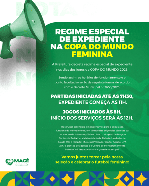 PREFEITURA DE MAGÉ DECRETA HORÁRIO ESPECIAL DE TRABALHO DURANTE JOGOS DA SELEÇÃO FEMININA DURANTE A COPA DO MUNDO