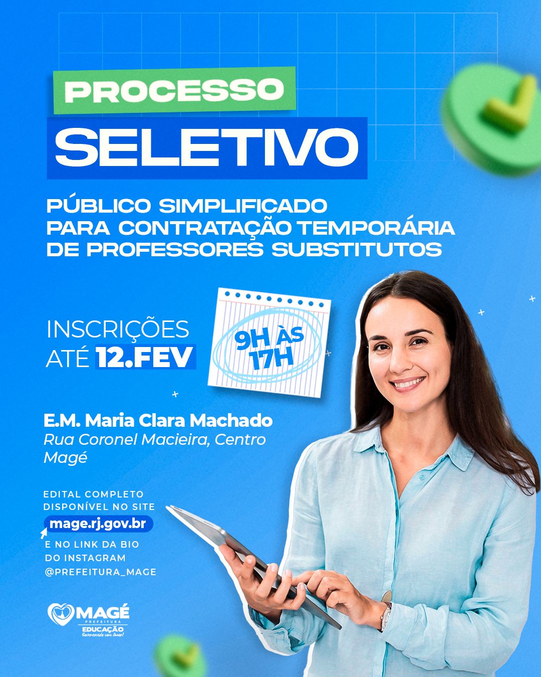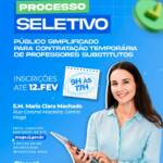 Processo Seletivo Simplificado para contratação temporária de professor substituto e formação de cadastro de reserva para atuarem em sala de aula na Educação Infantil; Anos Iniciais do Ensino Fundamental e Educação de Jovens e Adultos; Anos Finais do Ensino Fundamental e Educação de Jovens e Adultos nas disciplinas de Língua Portuguesa, Matemática, Artes, Ciências, História, Geografia e Inglês.